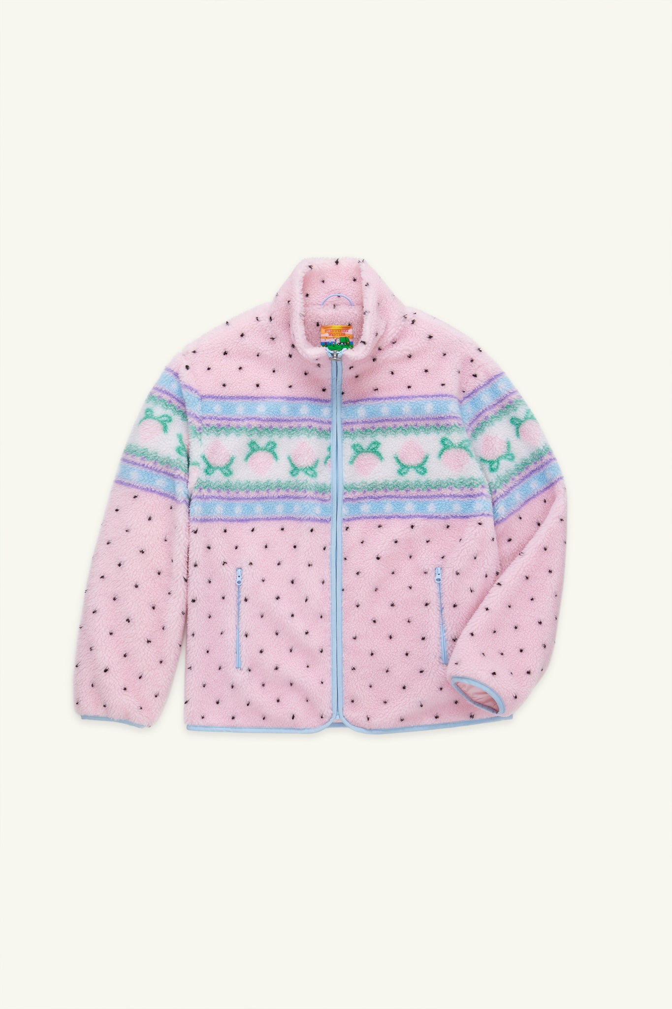 Kawaii fluffy jacquard knit sherpa fleece jacket in a strawberry border motif. Stretch binding, special heart zipper pull and full interior lining.