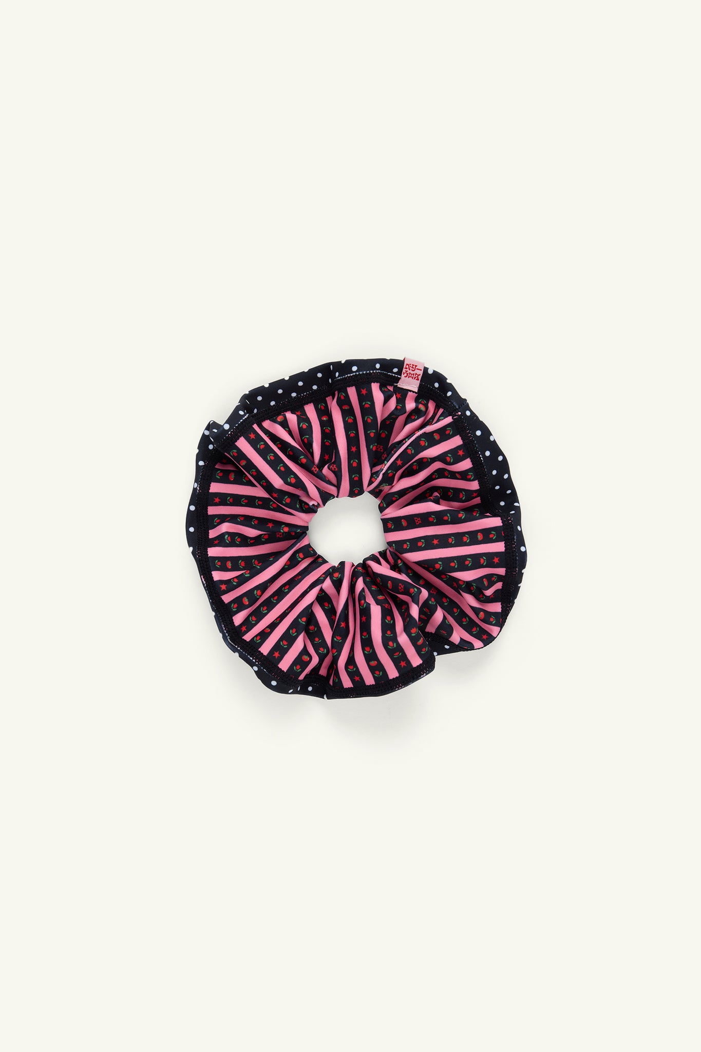 Dress like a star for your next workout class with the finishing touch of a super cute scrunchie to match your workout set. Comes in a hand-drawn, floral border stripe print with contrasting polka dot trim. Made in our 73% GRS certified Recycled Polyester 27% Elastane knit fabric. Moisture wicking with a UPF 50 finish. Perfect for the gym, court, workout studio or rave.