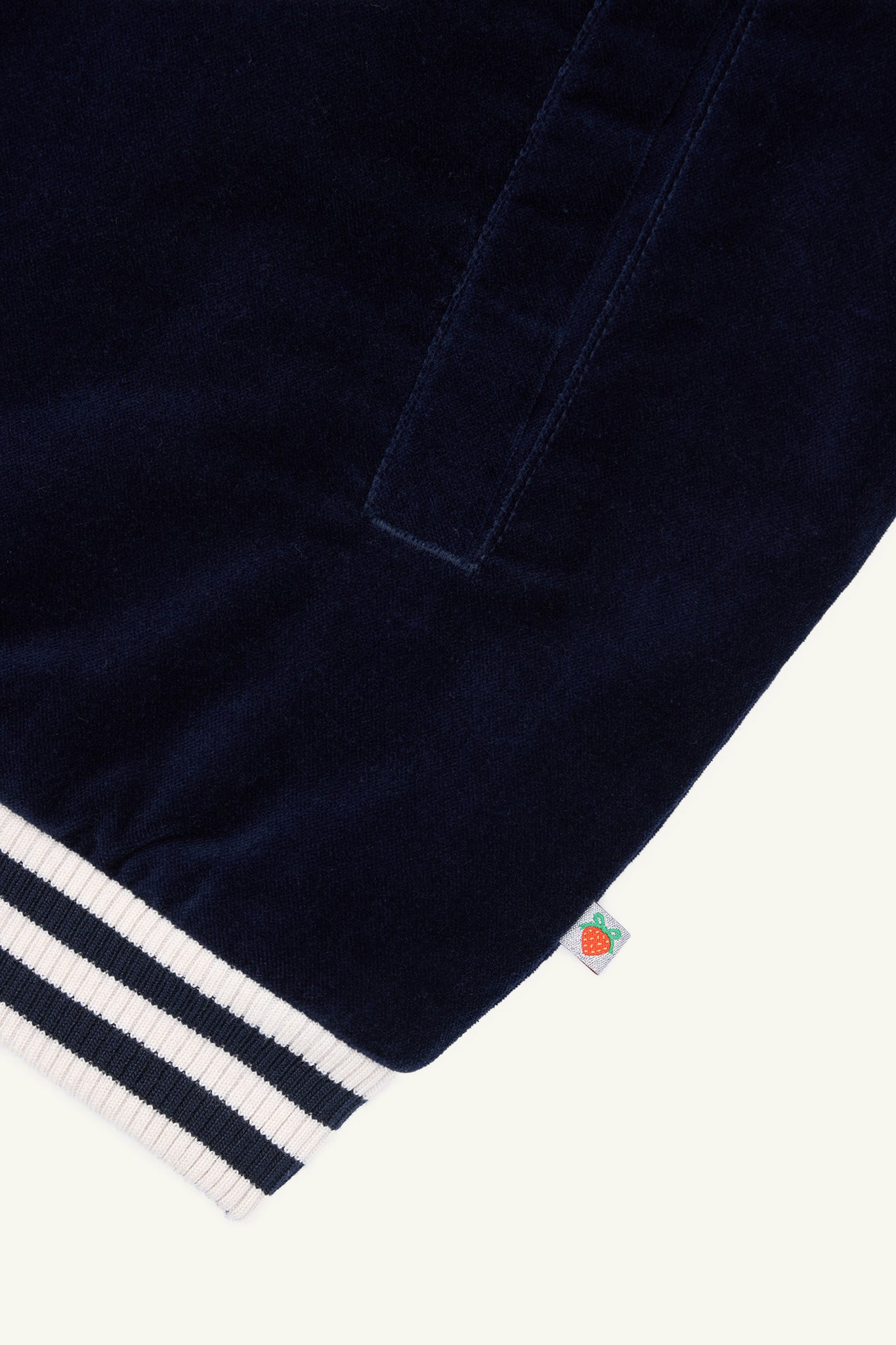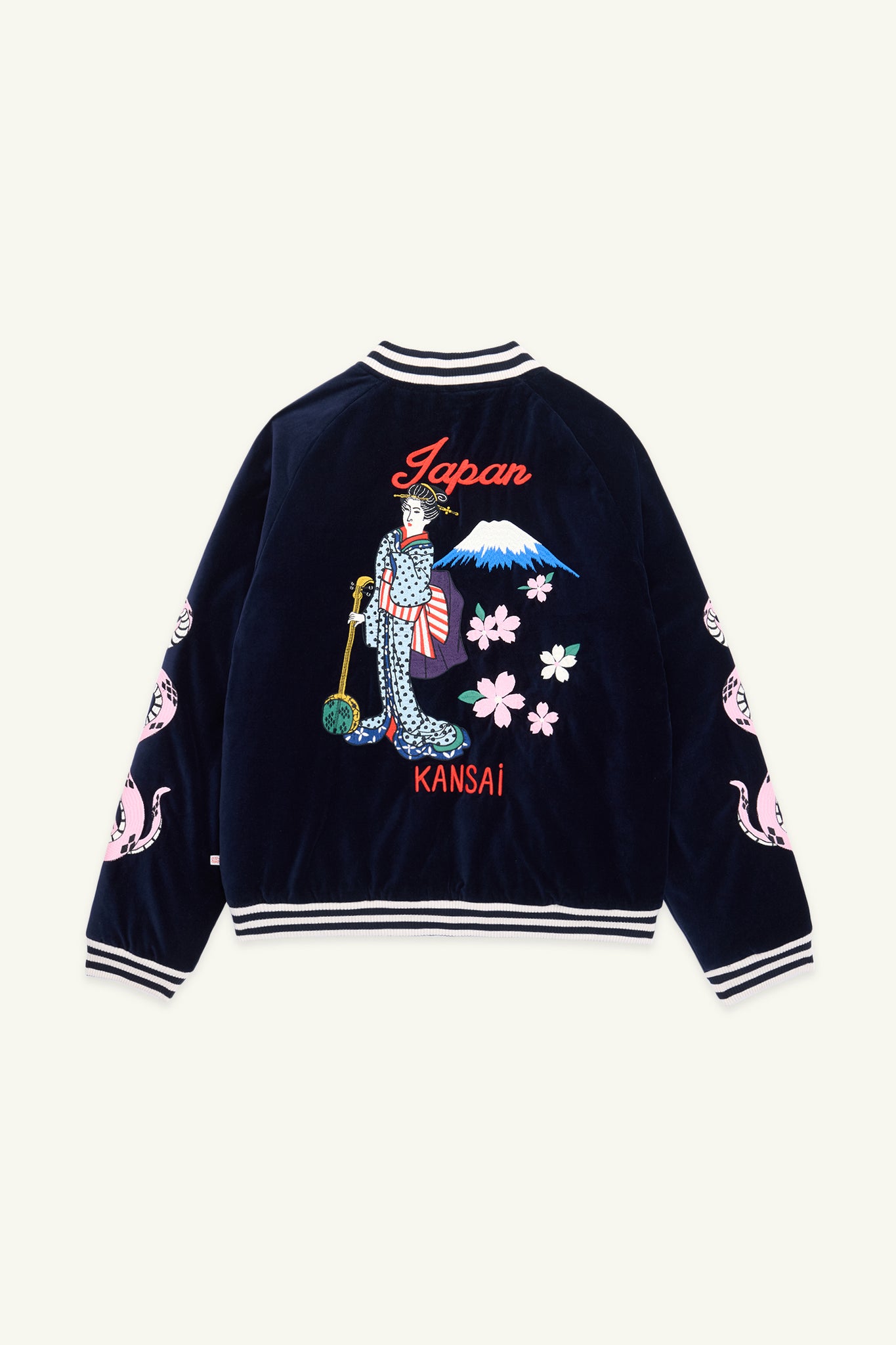 Our version of the classic Japanese Yokosuka Jumper, or Sukajan, comes in a deep navy velvet with a heavy baby pink, satin quilted lining and a striped rib trim at the neck, sleeves and waist. With our take on the Sukajan artwork, the jacket features extensive embroidery work; skull motifs at the chest, pink snakes (for Year of the Snake) on the sleeves and an iconic Japan scene at the back. Special, holiday metallic label at the waist.